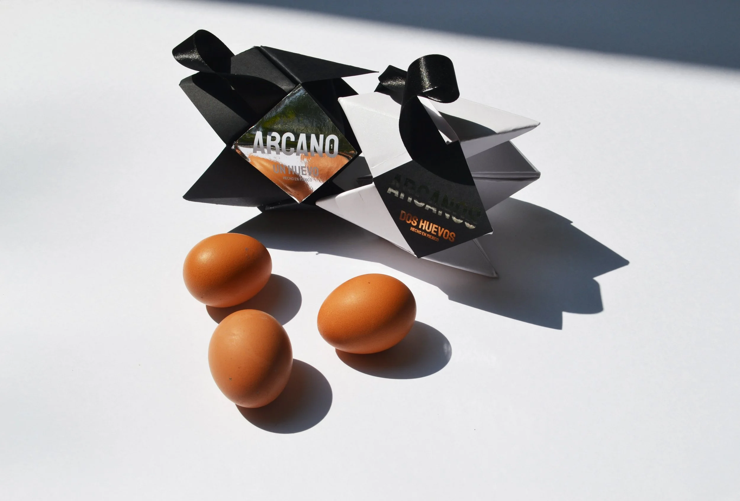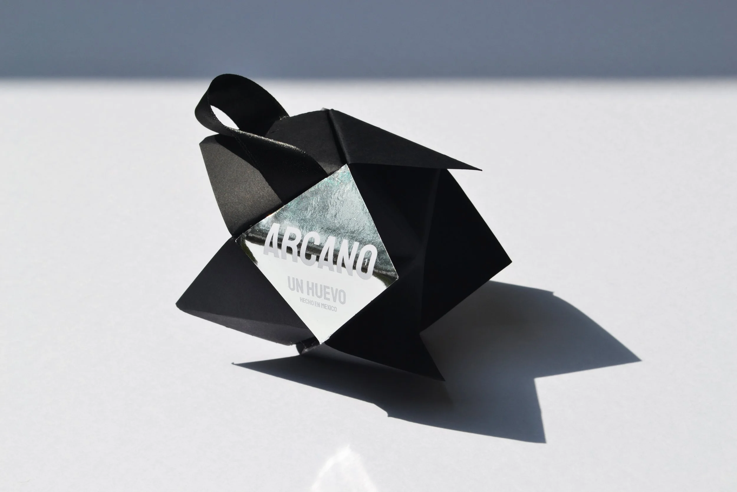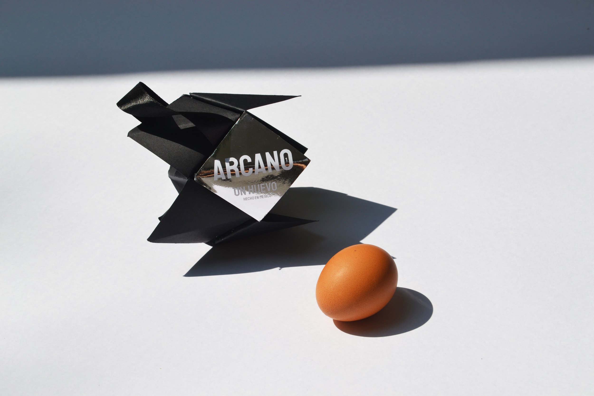 Este empaque para huevos se llama Arcano para hacer referencia a su mismo significado “lo misterioso”. No se puede ver el huevo por fuera. En la etiqueta el uso de foil es para hacer referencia “the magic of creation” que viene del simbolismo del huevo. Con el objetivo de crear una experiencia al consumidor de hacer algo extraordinario a lo ordinario. El empaque color negro y blanco son simbolismo de lo puro y lo misterioso que puede ser el futuro.