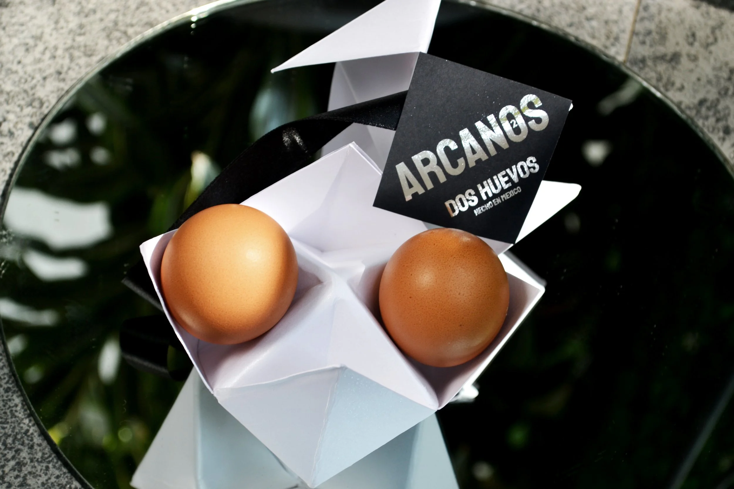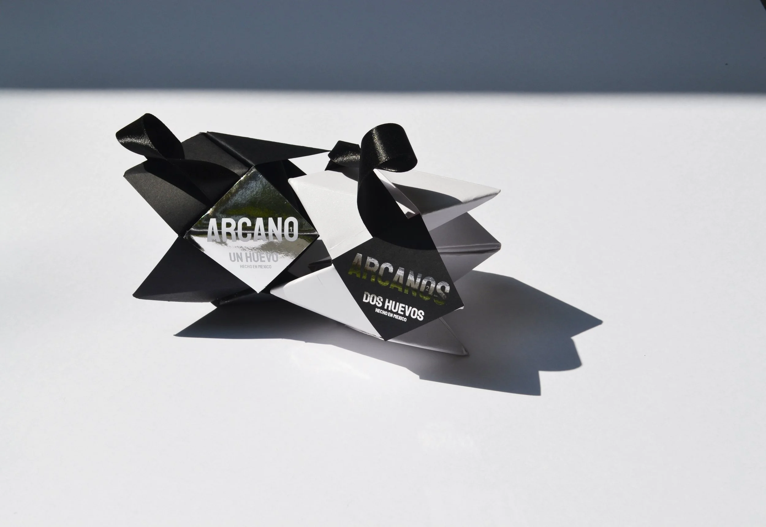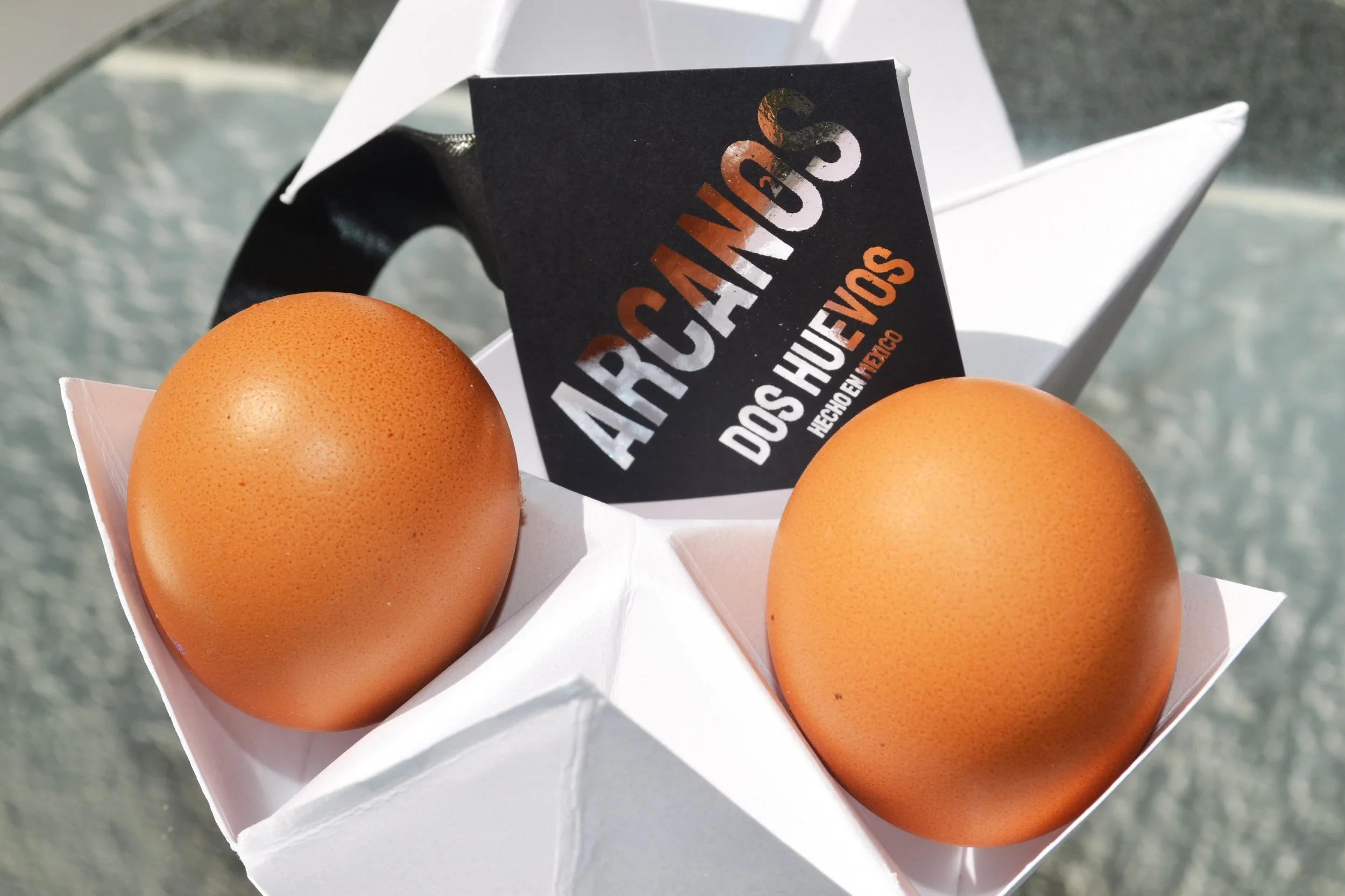 Este empaque para huevos se llama Arcano para hacer referencia a su mismo significado “lo misterioso”. No se puede ver el huevo por fuera. En la etiqueta el uso de foil es para hacer referencia “the magic of creation” que viene del simbolismo del huevo. Con el objetivo de crear una experiencia al consumidor de hacer algo extraordinario a lo ordinario. El empaque color negro y blanco son simbolismo de lo puro y lo misterioso que puede ser el futuro.